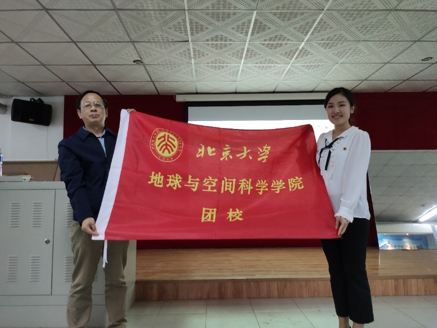 随后三位出席老师为学员代表佩戴团徽,学员代表进行了发言。2019级本科生王述冰同学讲述了自开学军训以来自身思想意识的转变发展过程,他希望可以在北大这个红色种子发芽的地方积极向党组织靠拢,也希望珍惜团校的学习机会,不断提升自己。在发言的最后,王述冰庄严承诺将一丝不苟、脚踏实地参加团校学习,做一个有担当的地空青年。2018级硕士班王凯同学讲述了他参加七十周年国庆群众游行的难忘经历,这段经历让他深刻意识到新时代更需要北大青年积极努力去实现中华民族的伟大复兴;他也希望可以通过团校学习不断提升自身理论素养,将来更好地为国家服务。