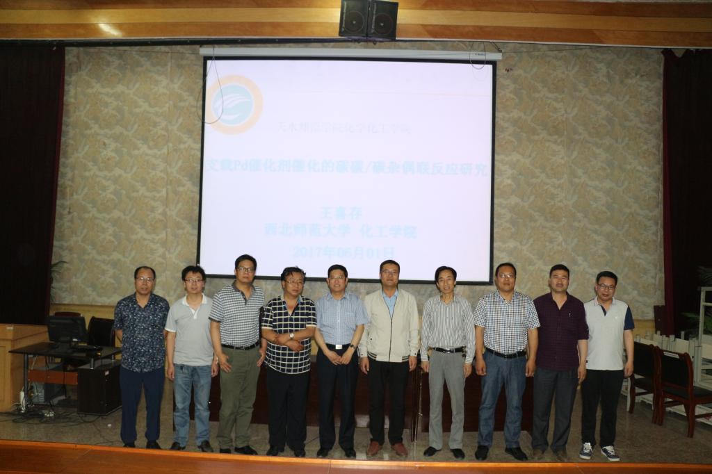 王喜存教授从有机亲电试剂的选择入手,介绍了有关嘧啶酮衍生物的合成、金属催化黄酸酯参与的偶联反应以及含硫化合物参与的选择性C_C、C_S交叉偶联反应,及羊毛支载钯催化剂的合成及其催化的C_C偶联反应、石墨烯支载钯催化剂的合成及其催化的C_C偶联反应、自组装钯微球催化Suzuki、Heck偶联反应、离子液体负载的希夫碱钯催化剂、基于苯并噻唑的含离子液体自组装钯纳米粒子催化剂等一系列研究成果。最后王教授还解答了部分老师、同学提出的问题。