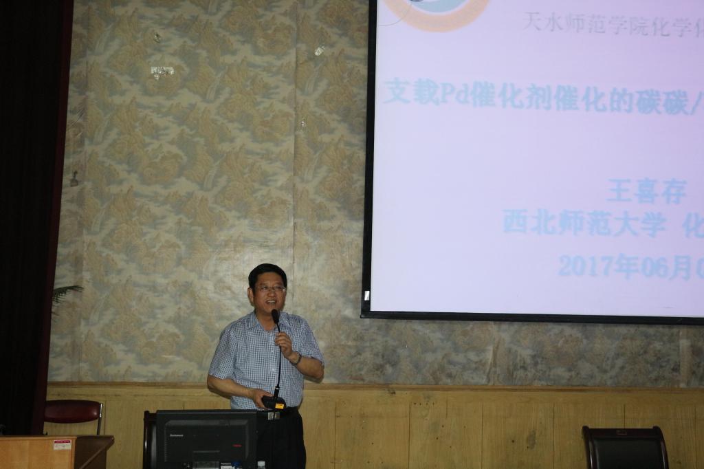 6月1日晚,在1号报告厅,西北师范大学博士生导师王喜存教授,为YABO官网师生做了题为“关于支载Pd催化剂催化的碳碳/碳杂偶联反应研究”的学术报告,报告会由YABO官网副院长吕玲玲博士主持,研究生处左国防处长、YABO鸭脖官网党总支书记王小芳、院长刘新文,副书记雷新有、副院长杨富巍、吕玲玲及部分教师及学生大约200余人聆听了报告。