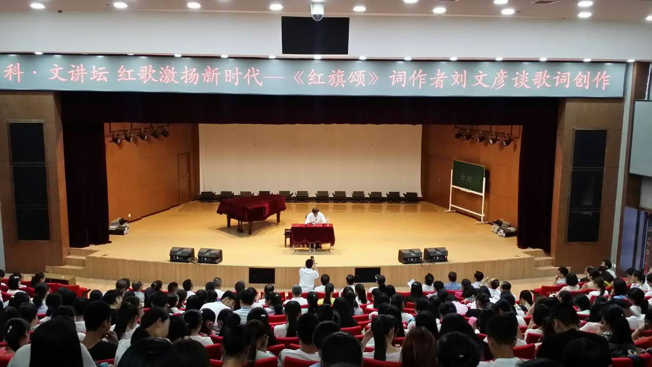 2016年6月27日晚,革命史诗大合唱《红旗颂》词作者刘文彦先生亲临YABO鸭脖官网,在音乐厅为YABO官网教职工及学生做了题目为《红歌激扬新时代——革命史诗大合唱<红旗颂>创作背景》的报告。