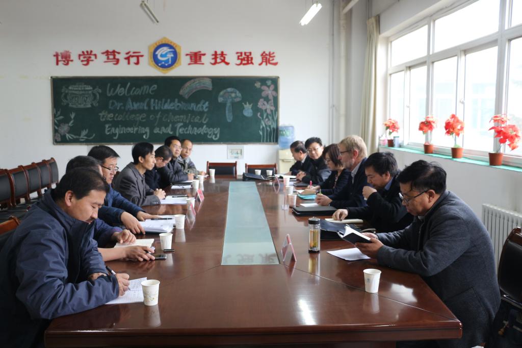 11月14日上午,YABO鸭脖官网党政领导班子及部分教师在YABO鸭脖官网会议室(3号实验楼211)举行座谈会欢迎德国专家Dr. Hildebrandt axel教授来YABO官网指导学科及专业建设等工作。刘新文院长首先代表YABO鸭脖官网对Dr. Hildebrandtaxel来校指导YABO官网学科、专业及实验室等建设工作表示热烈的欢迎和衷心的感谢,之后刘院长介绍了学校的历史沿革、办学规模、学科研究、专业建设、人才培养等情况,希望德国专家此行能为YABO官网的专业、学科建设、课程设置、师资队伍及人才培养等方面给予指导,进一步推动YABO官网向应用技术型转型与发展。