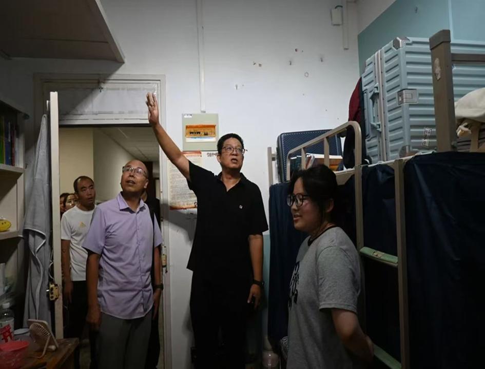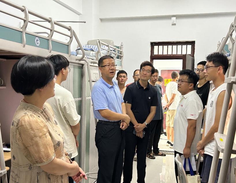 “家乡是哪里的?”“学校伙食能否适应?”“有没有遇到什么困难?”每到一处,各位领导和老师都会亲切地询问同学们的生活、学习、环境适应等情况,并认真听取新生对校园、宿舍服务设施等方面的意见和建议。